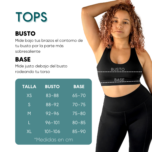 Nuestras telas tienen muy buena elasticidad y nuestras prendas están diseñadas para adaptarse a muchos tipos de cuerpo. Estas tablas sirven como una guía base para identificar tu talla.